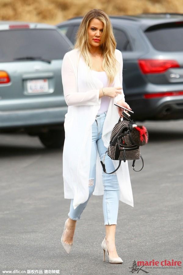 Khloe Kardashian身穿長(zhǎng)衫搭配破洞仔褲,手拎mini雙肩背出街。