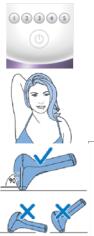 2. 處理腋下區(qū)域時,只需將飛利浦脈沖光脫毛儀完全按壓在肌膚上,綠色指示燈提示產(chǎn)品完全接觸肌膚,進(jìn)行閃光即可;