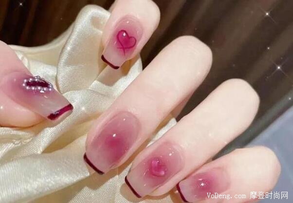 這款美甲中間是帶一點梅子紫,原本梅子紫看起來非常顯老氣,但是這一款美甲加了點小心機,在中間加了個愛心,像果凍一樣,晶瑩剔透又軟軟的,這款美甲看起來非常溫柔,可以沖一波。