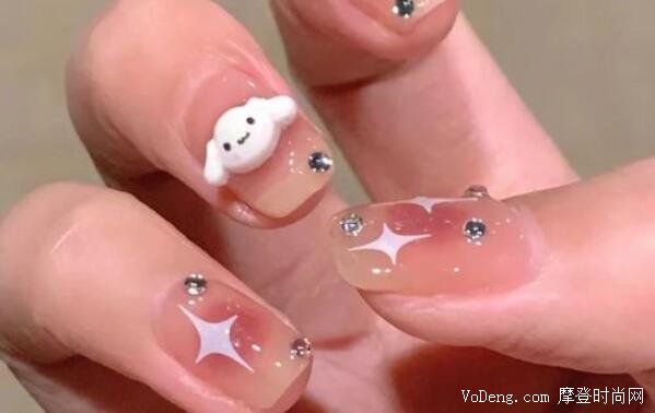 經典可愛的玉桂狗元素,貼在美甲上,讓喜歡玉桂狗的姐妹們愛的不得了,用小鉆石裝飾,中間畫出bulingbuling的光,簡直要萌化了老夫的少女心,這款美甲非常適合小個子,可可愛愛的女生。