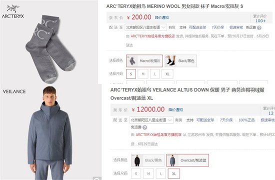 在中國(guó)京東官網(wǎng)上,始祖鳥(niǎo)在售的價(jià)格最低的產(chǎn)品是它家的MERINO WOOL男女同款襪子,一雙襪子價(jià)高200元;而價(jià)格最高的是VEILANCE ALTUS DOWN男子商務(wù)連帽羽絨服,一件售價(jià)12000元。