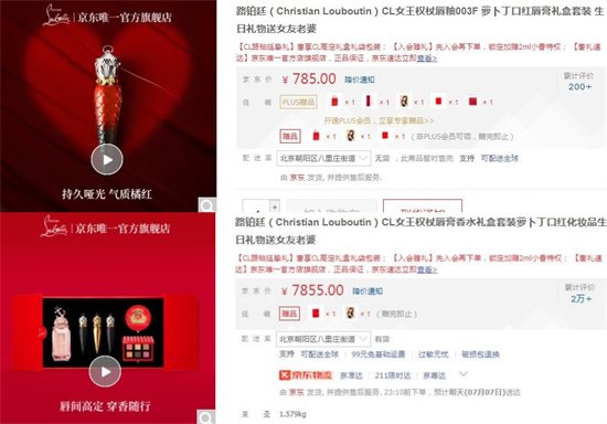 CL家的蘿卜丁口紅最便宜的女王權杖唇釉003F,要785元,而它家的CL女王權杖唇膏香水禮盒套裝,要7855元。但是一套產品里面有香氛、有三支口紅,還有它家的明星同款粉底液以及眼影盤,這樣看來,組合購買還是比較劃算的。
