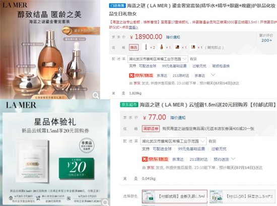 它家最貴的是主打抗老修復的鎏金奢寵套裝,一套要18900元;而最便宜的是它家的云絨霜1.5ml的小樣,一個就要77元。