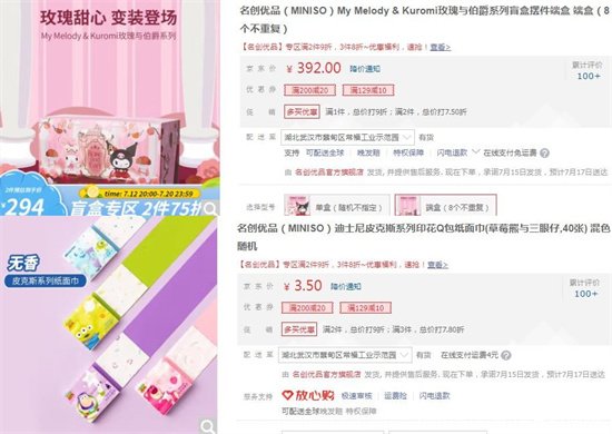 在名創優品的眾多產品中,最貴的是My Melody & Kuromi玫瑰與伯爵系列盲盒擺件端盒,一套有8個盲盒,要392元;而最便宜的是迪士尼皮克斯系列印花Q包紙面巾,一包紙要3.5元。