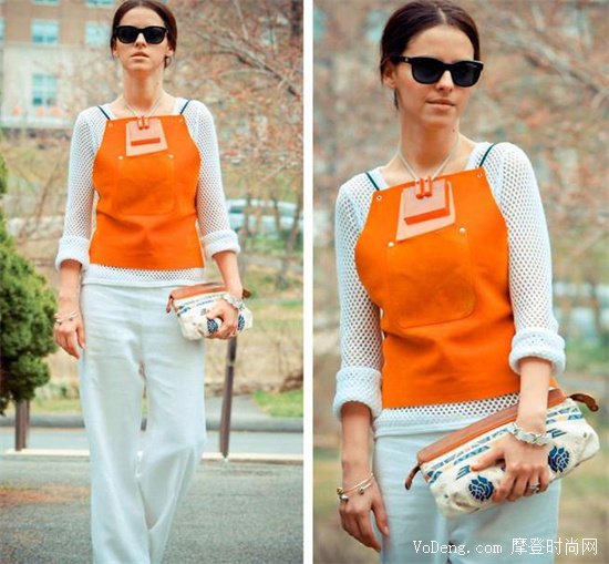白色作為一個萬能的顏色,與亮眼的橙色搭配起來也不為過!橙色的青春活潑、白色的經典復古,組合起來,不僅視覺上非常減齡,而且還時尚感滿滿,是很適合夏天的一個組合!