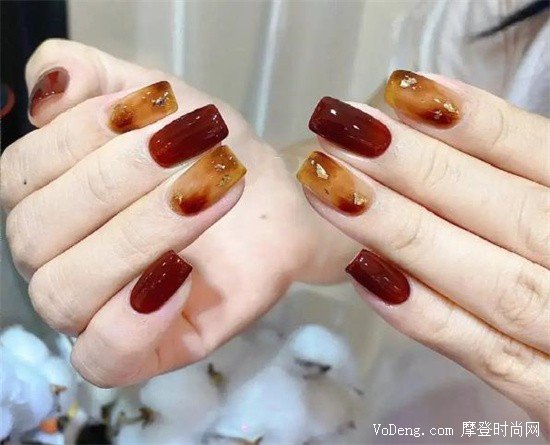 這款紅棕類型的美甲,是比較適合秋冬兩季的,但是你在春夏做這個款式,也是非常顯手白、顯氣質的。像金箔一樣的細閃以及琥珀的獨特設計,都非常有韻味。