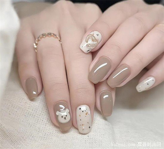 這款美甲很適合喜歡走可愛風格的女生去嘗試,也是一年四季都能做的萬能款式。小熊的樣子非常可愛,米咖兩色的混搭與鵪鶉蛋顏色的跳色,十分融洽,非常顯白的一個款式。