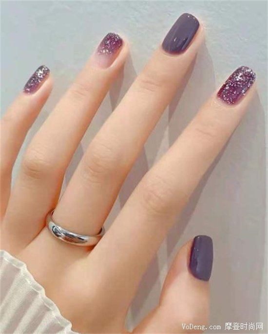 這款美甲,則是采用葡萄紫的顏色,而暗藏的漸變顏色又非常顯氣質,細閃的融入,也恰到好處。不管你身處什么季節,這款美甲總能使你的手顯白兩個度!